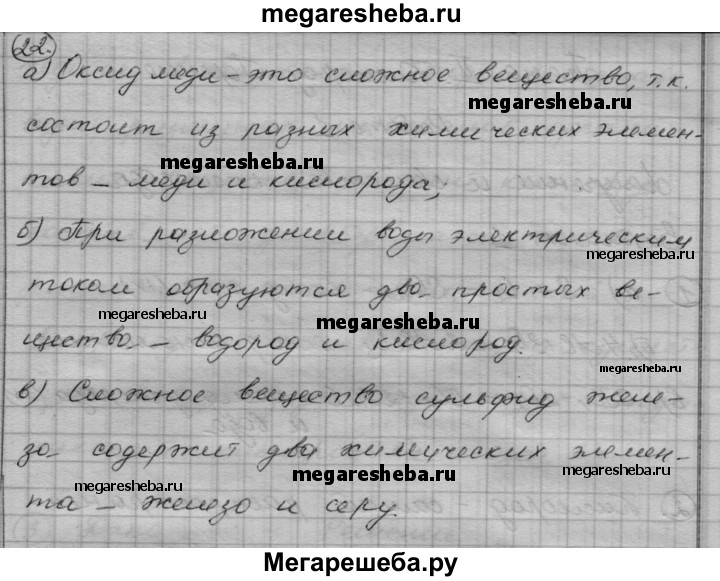 22. В приведенных предложениях вместо точек вставьте в нужном числе и падеже необходимые по значению слова: химический элемент, простое вещество, сложное вещество. а) Оксид меди — это ..., так как состоит из разных ... — меди и кислорода. б) При разложении воды электрическим током образуются два ... — водород и кислород. в) ... сульфид железа содержит два ... — железо и серу.