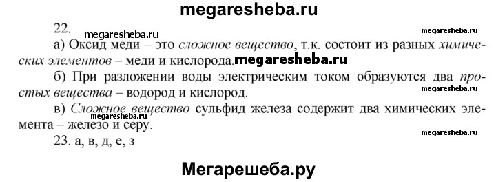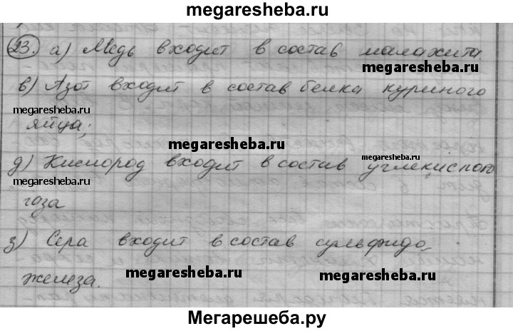 23. Выпишите предложения, в которых речь идет о химическом элементе, а не о простом веществе. а) Медь входит в состав малахита. б) Пластинка изготовлена из меди. в) Азот входит в состав белка куриного яйца. г) Азот содержится в воздухе. д) Кислород входит в состав углекислого газа. е) Железо содержится в гемоглобине крови человека. ж) Сера легко плавится. з) Сера входит в состав сульфида железа.