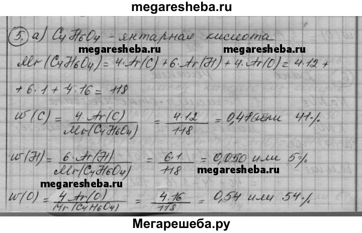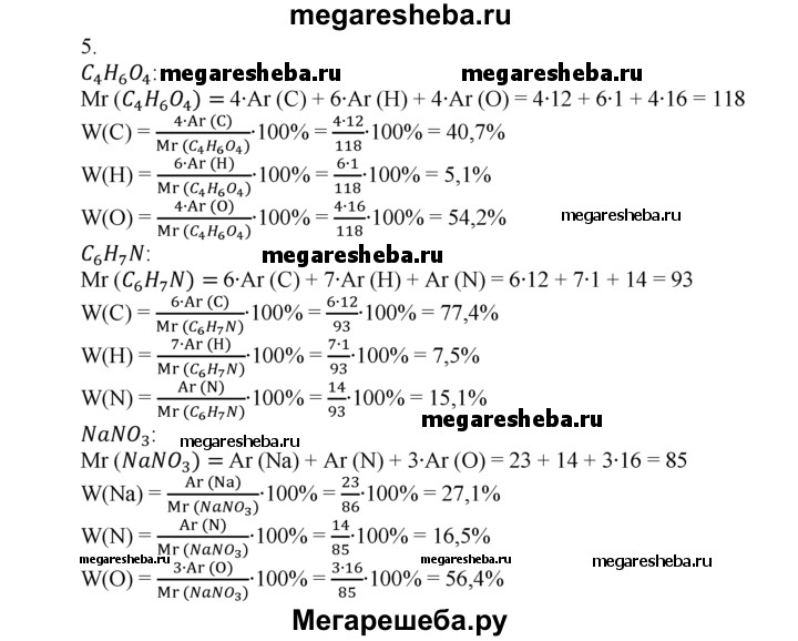 5. Вычислите массовую долю каждого элемента: а) в янтарной кислоте С4Н6O4; б) в анилине C6H7N; в) в натриевой селитре NaNO3.