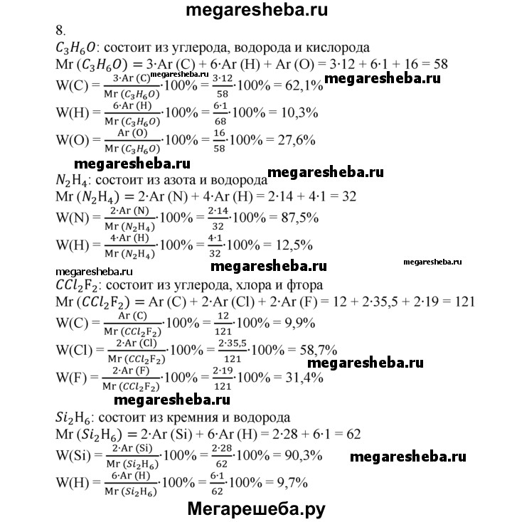 8. Какие сведения о веществе можно получить, зная его химическую формулу? а) С3Н6O (ацетон); б) N2H4 (гидразин); в) CCI2F2 (фреон); г) Si2H6 (дисилан).