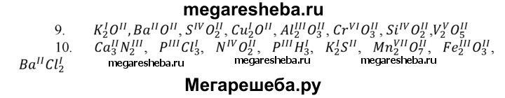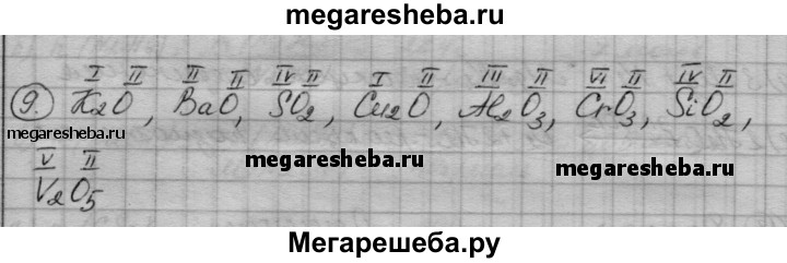 9. Определите валентность элементов в следующих соединениях: К2O, BaO, SO2, Cu2O, АI2О3, СrO3, SiO2, V2O5.