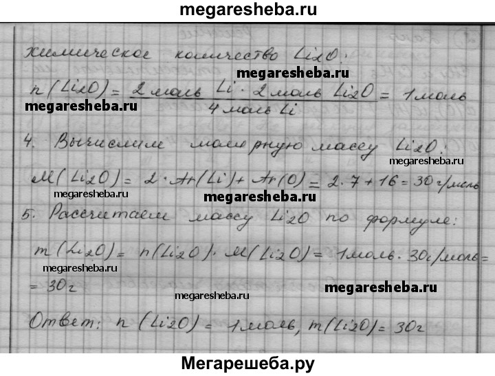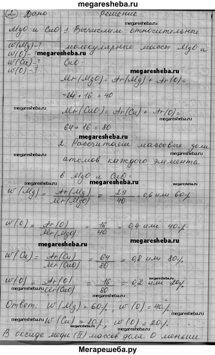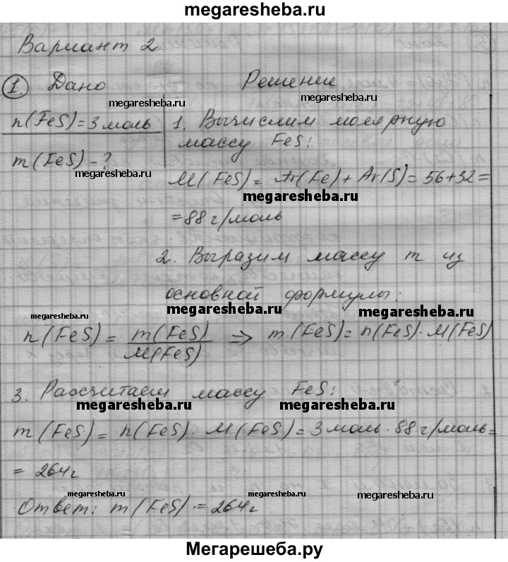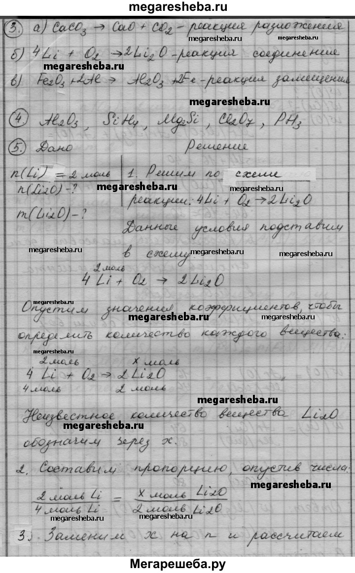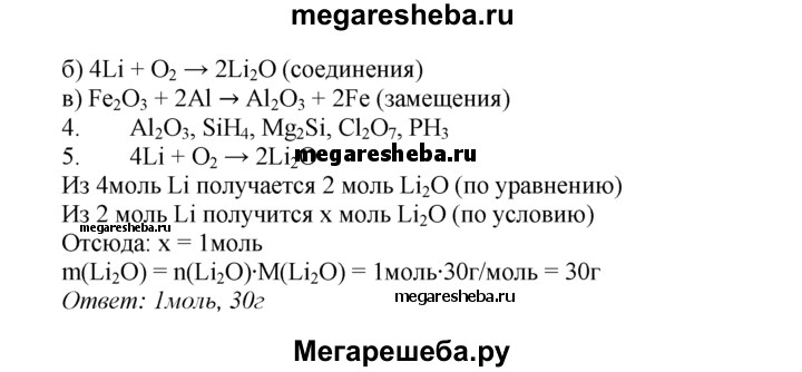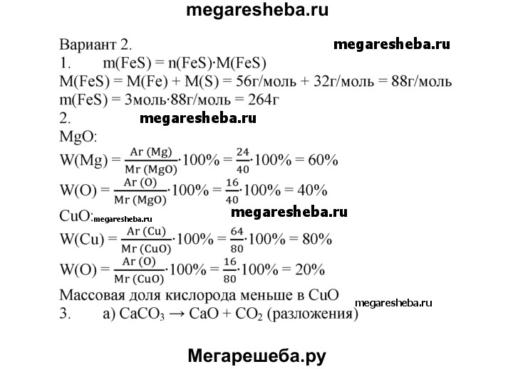 Вариант 2 1. Чему равна масса 3 моль сульфида железа FeS? 2. Рассчитайте массовую долю каждого элемента в оксиде магния и в оксиде меди(ll). В каком из этих оксидов массовая доля кислорода меньше? 3. Перепишите приведенные ниже схемы реакций, расставьте в них коэффициенты и укажите, к какому типу относится каждая из реакций. а) СаСO3 —> СаО + СO2 б) Li + O2 —> Li2O в) Fe2O3 + АI —> АI2O3 + Fe 4. Составьте химические формулы следующих соединений: МхОу, SixHy, MgxSiy, СIх^VllОу, Рx^lllНy 5. Вычислите количество вещества и массу образовавшегося оксида лития Li2O, если в реакцию с кислородом вступило 2 моль лития. Схема реакции: Li + O2 —> Li2O