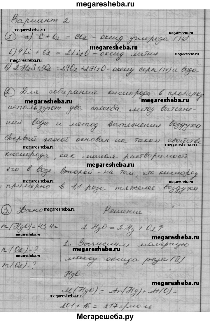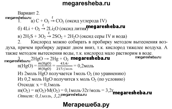 Вариант 2 1. Напишите уравнения реакций горения в кислороде: а) угля; б) лития; в) сероводорода H2S (сера в образующемся оксиде четырехвалентна). Назовите продукты реакций. 2. Какими способами можно собирать кислород в пробирку? На каких свойствах кислорода основаны эти способы? 3. Рассчитайте количество вещества и массу кислорода, образующегося при разложении 43,4 г оксида ртути(Н). Уравнение реакции: 2HgO = 2Hg + O2Î