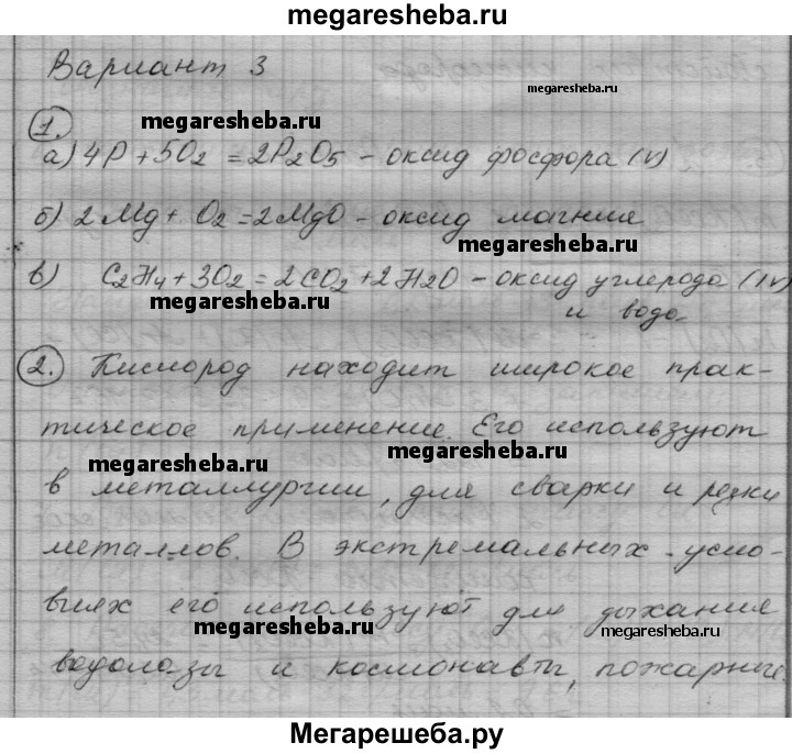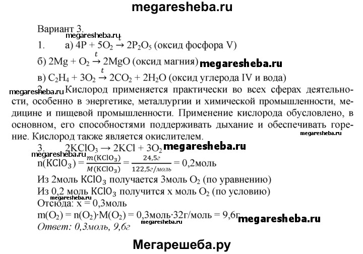 Вариант 3 1. Напишите уравнения реакций горения в кислороде: а) фосфора; б) магния; в) этилена С2Н4 (углерод в образующемся оксиде четырехвалентен). Назовите продукты реакций. 2. Перечислите известные вам области применения кислорода. Укажите, на каких свойствах кислорода они основаны. 3. Рассчитайте количество вещества и массу кислорода, образующегося при разложении 24,5 г хлората калия КСIO3. Уравнение реакции: 2КСIO3 = 2КСI + 3O2Î