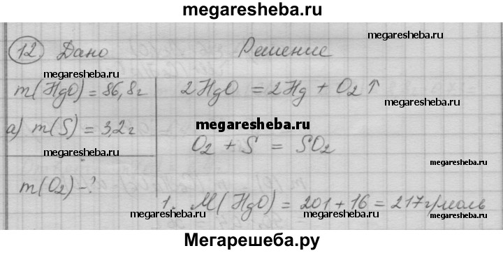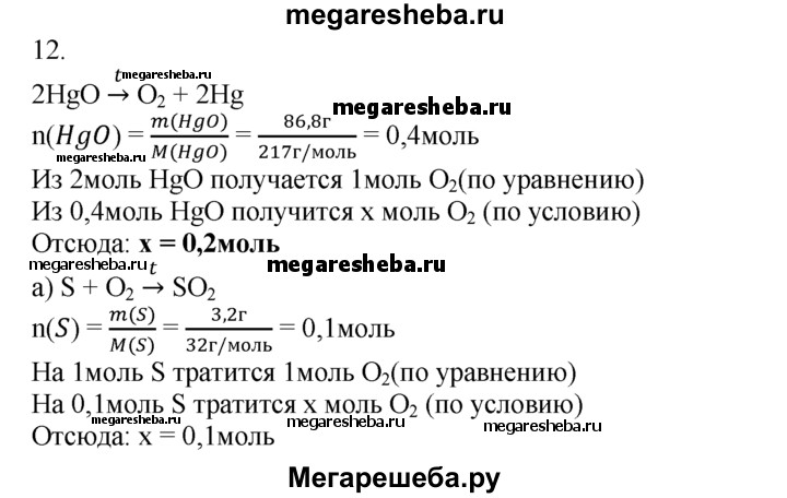 12. Рассчитайте, хватит ли кислорода, выделившегося при разложении 86,8 г оксида ртути(ll), для полного сжигания: а) 3,2 г серы; б) 2 г метана СН4; в) 5,4 г алюминия; г) 31 г фосфора.