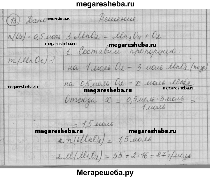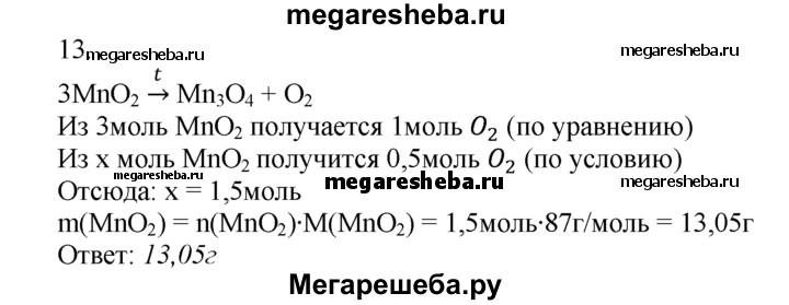 13. При прокаливании оксида марганца(lV) образуется оксид состава Мn3O4 и выделяется кислород. Вычислите массу оксида марганца(lV), который нужно прокалить, чтобы получить 0,5 моль кислорода.