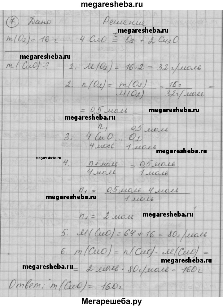7. При прокаливании оксида меди(ll) выделяется кислород и образуется оксид меди(l). Составьте уравнение этой реакции и рассчитайте массу прореагировавшего оксида меди(ll), если выделилось 16 г кислорода.