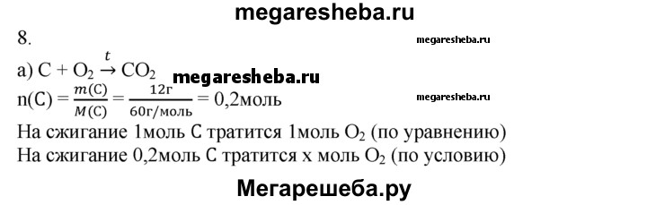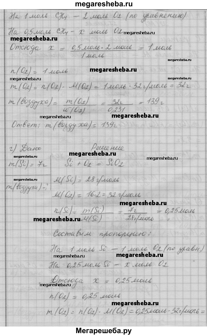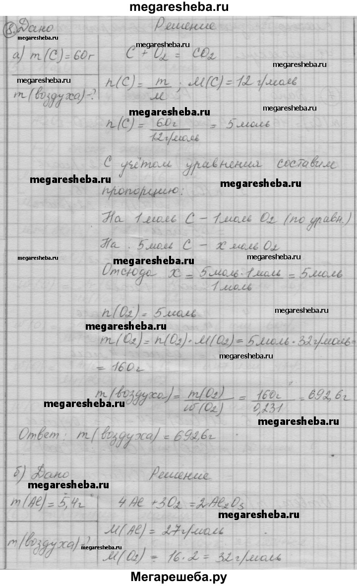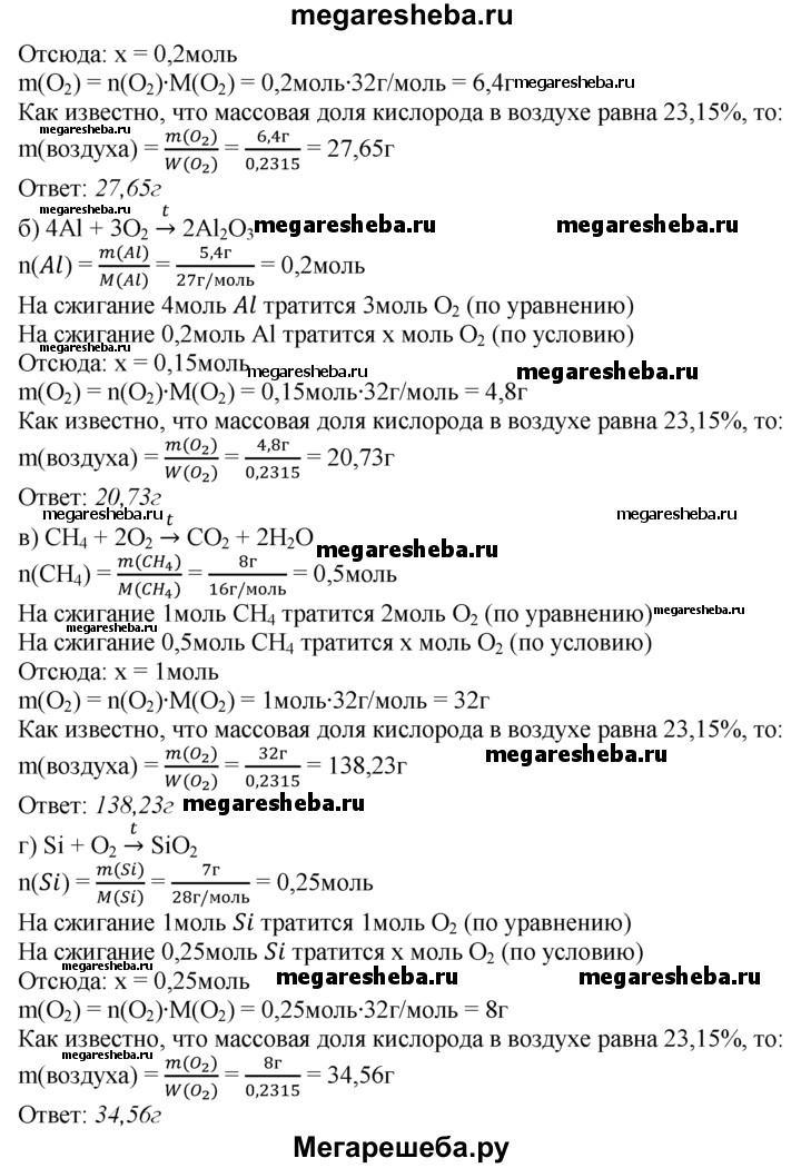 8. Рассчитайте, какая масса воздуха необходима для полного сгорания: а) 60 г угля; б) 5,4 г алюминия; в) 8 г метана СН4; г) 7 г кремния Si.