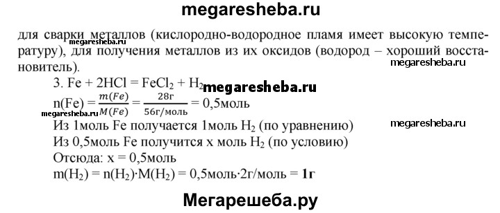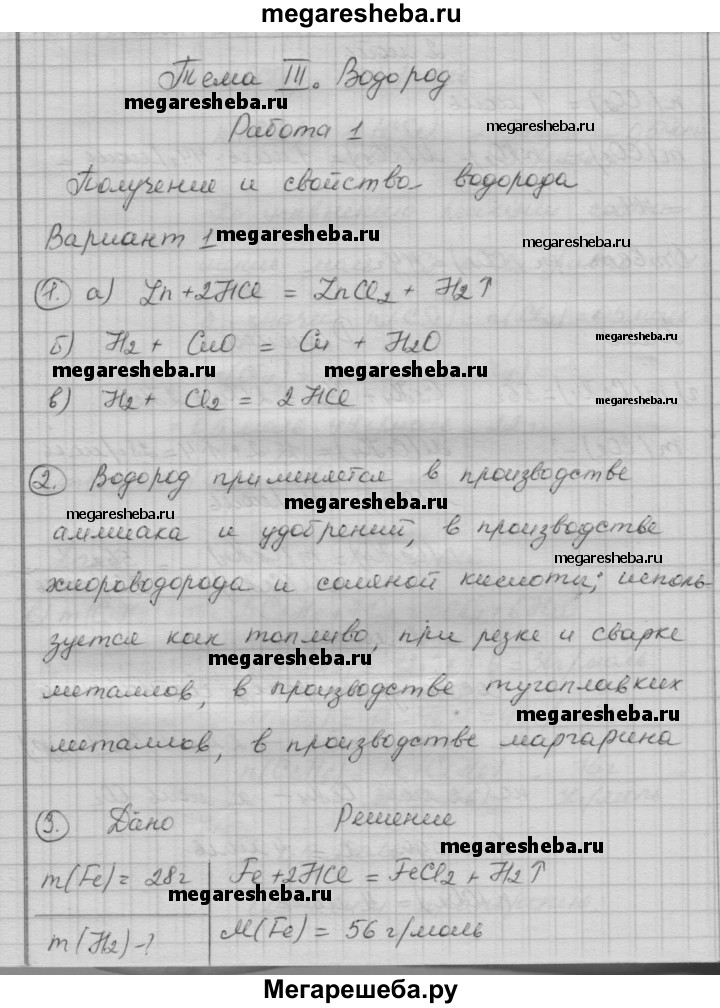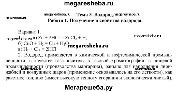 Вариант 1 1. Напишите уравнения реакций: а) цинка с соляной кислотой; б) водорода с оксидом меди(ll); в) водорода с хлором (хлор в образующемся соединении одновалентен). 2. Перечислите известные вам области применения водорода. Укажите, на каких свойствах водорода они основаны. 3. Рассчитайте массу водорода, образующегося при взаимодействии 28 г железа с соляной кислотой. Уравнение реакции: Fe + 2НСI = FeCl2 +H2Î