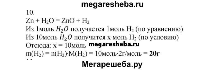 10. Раскаленный цинк реагирует с водяным паром с образованием оксида цинка и водорода. Составьте уравнение этой реакции и рассчитайте количество вещества и массу образовавшегося водорода, если в реакцию с цинком вступила вода количеством вещества 10 моль.
