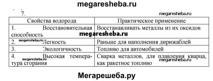 7. Заполните таблицу. Покажите, на каких свойствах водорода основано его практическое применение.
