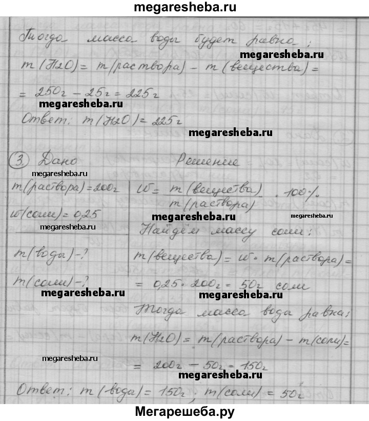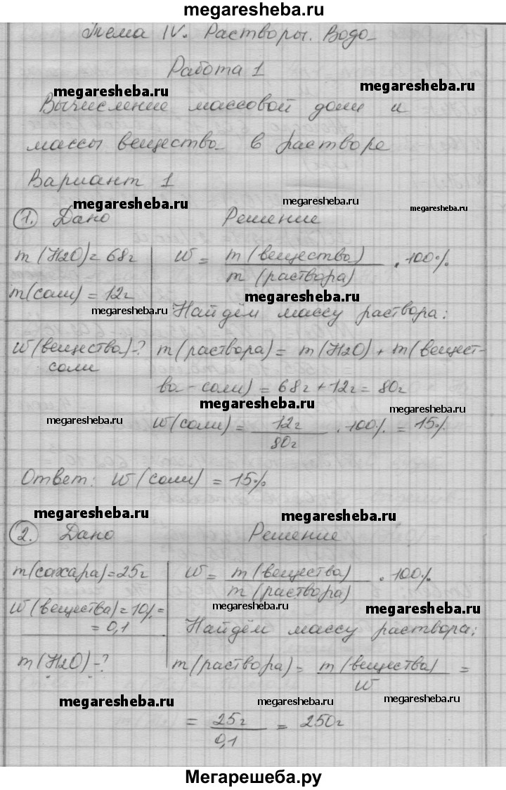 Вариант 1 1. Вычислите массовую долю растворенного вещества, если в 68 г воды растворили 12 г соли. 2. Вычислите массу воды, в которой нужно растворить 25 г сахара, чтобы получить раствор с массовой долей растворенного вещества 10%. 3. Рассчитайте массы воды и соли, которые нужно взять для приготовления 200 г раствора с массовой долей соли 0,25.