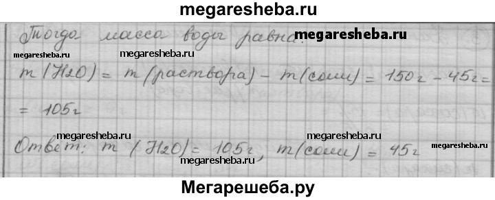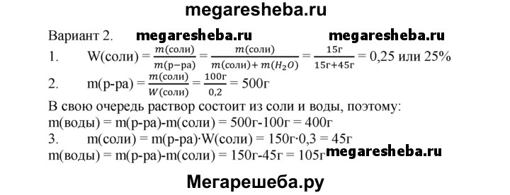 Вариант 2 1. Вычислите массовую долю растворенного вещества в растворе, приготовленном из 15 г соли и 45 г воды. 2. Рассчитайте, какую массу воды необходимо взять для приготовления раствора с массовой долей вещества 20%, если нужно растворить 100 г соли. 3. Рассчитайте массы воды и соли, которые нужно взять для приготовления 150 г раствора с массовой долей соли 0,3.