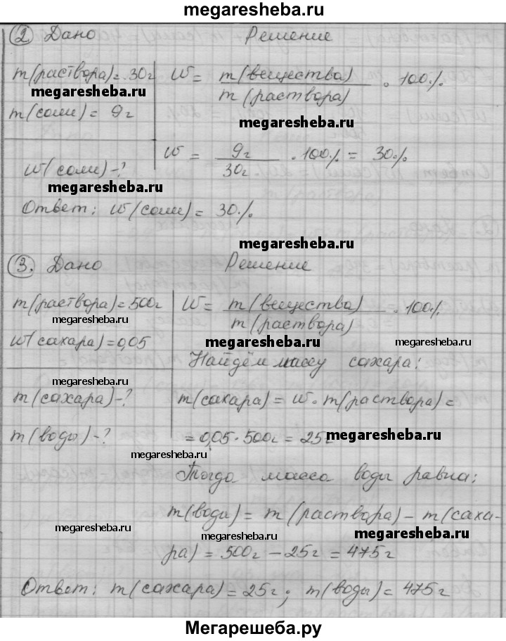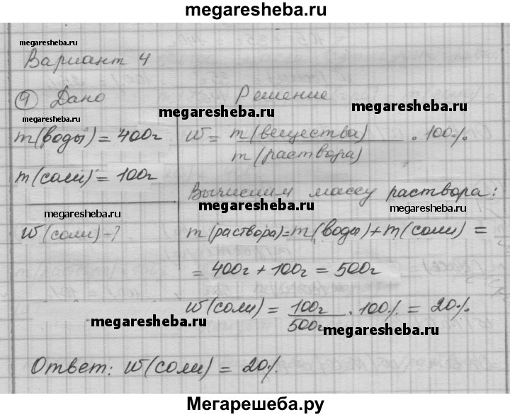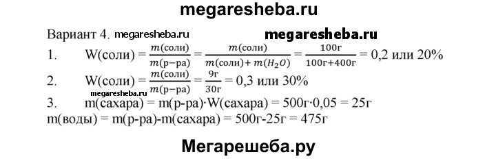 Вариант 4 1. В 400 г воды растворили 100 г соли. Рассчитайте массовую долю вещества в растворе. 2. При выпаривании 30 г раствора получили 9 г соли. Рассчитайте массовую долю растворенного вещества. 3. Рассчитайте массы сахара и воды, которые нужно взять для приготовления 500 г раствора с массовой долей сахара 0,05.