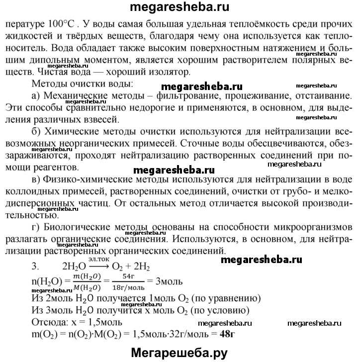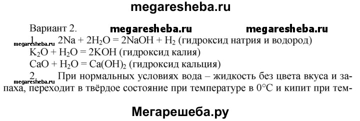 Вариант 2 1. Составьте уравнения реакций с водой следующих веществ: натрия, оксида калия, оксида кальция. Назовите вещества, образующиеся в результате реакций. 2. Опишите физические свойства воды и методы ее очистки. 3. Рассчитайте массу кислорода, образующегося при разложении 54 г воды.