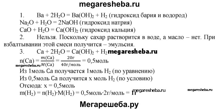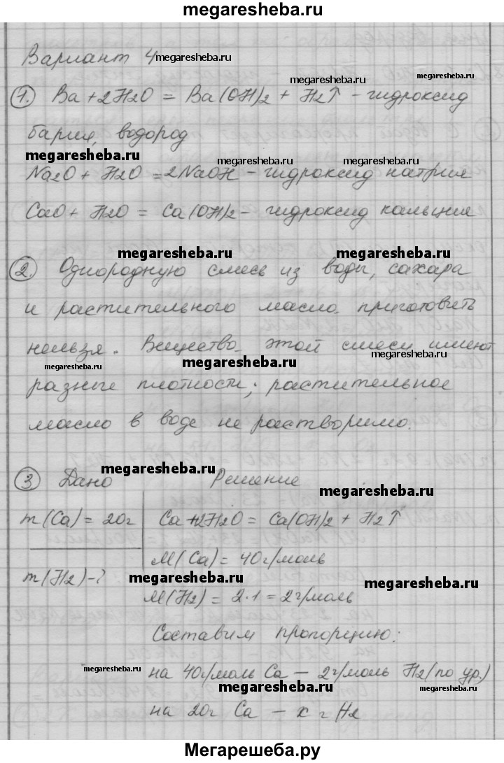 Вариант 4 1. Составьте уравнения реакций с водой следующих веществ: бария, оксида натрия, оксида кальция. Назовите вещества, образующиеся в результате реакций. 2. Можно ли приготовить однородную смесь из воды, сахара и растительного масла? Почему? 3. Рассчитайте массу водорода, выделившегося при взаимодействии с водой 20 г кальция.
