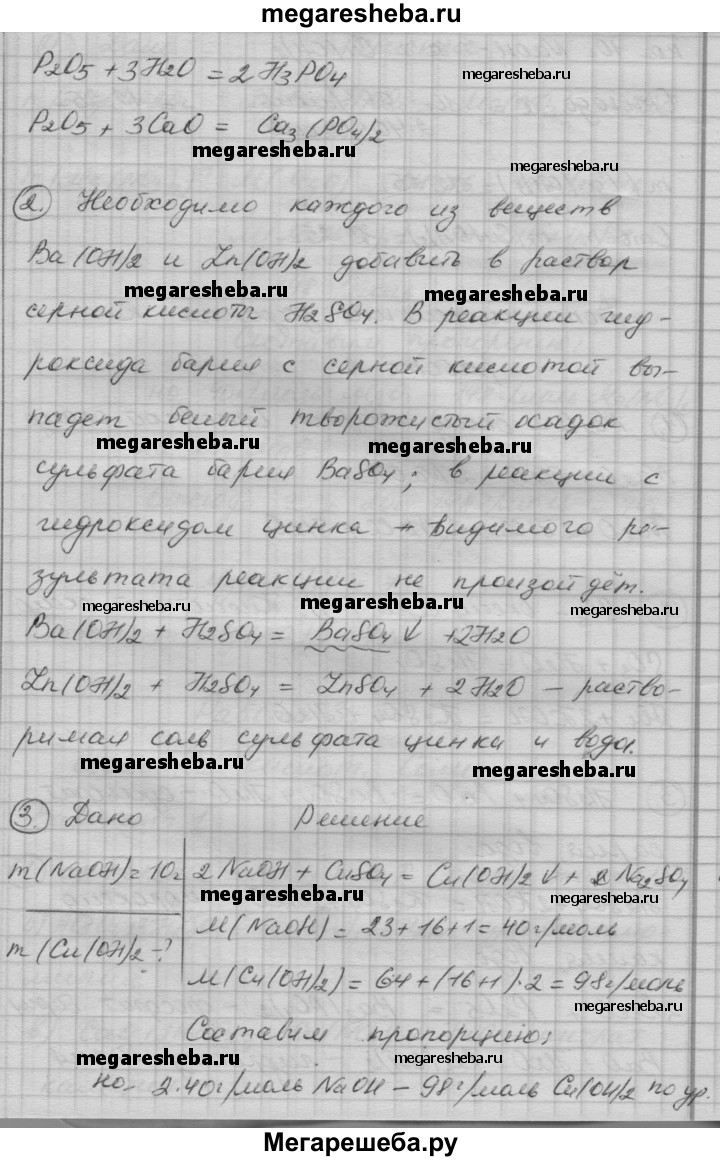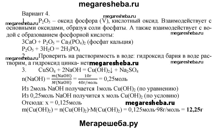 Вариант 4 1. Определите, к какому классу относится вещество, имеющее формулу Р2O5. Назовите его. Напишите уравнения двух химических реакций, наиболее ярко характеризующих его свойства как представителя указанного вами класса. 2. Вам выданы две пробирки с белыми порошкообразными веществами. Известно, что в одной из пробирок содержится Ва(ОН)2, а в другой — Zn(OH)2. Как опытным путем можно распознать эти вещества? 3. К раствору сульфата меди(ll) прилили раствор, содержащий 10 г гидроксида натрия. Рассчитайте массу образовавшегося осадка.