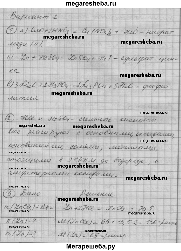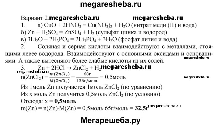 Вариант 2 1. Допишите уравнения реакций получения солей: а) CuO + HNO3 = б) Zn + H2SO4 = в) Li2O + Н3РO4 = Расставьте коэффициенты и назовите образующиеся соли. 2. Чем сходны химические свойства соляной и серной кислот? 3. В реакции цинка с соляной кислотой образовалось 68 г хлорида цинка. Рассчитайте массу и количество вещества цинка, вступившего в реакцию. Уравнение реакции: Zn + 2НСI = ZnCl2 + Н2Î