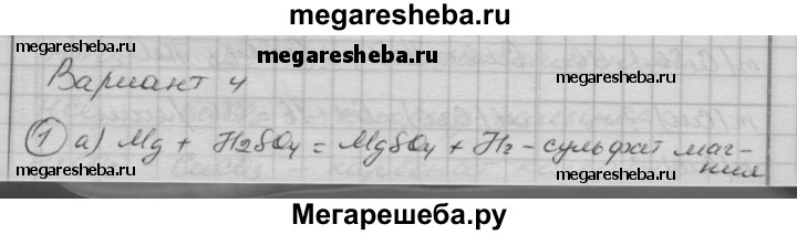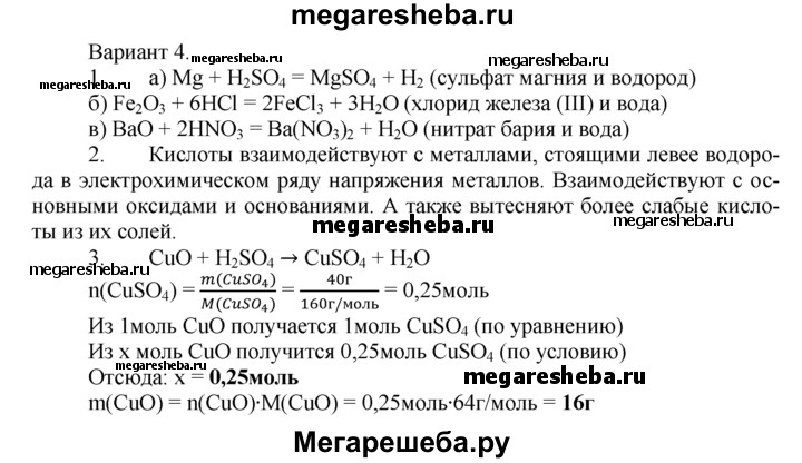 Вариант 4 1. Допишите уравнения реакций получения солей: а) Mg + H2SO4 = б) Fe2O3 + HCl = в) BaO + HNO3 = Расставьте коэффициенты и назовите образующиеся соли. 2. Перечислите общие химические свойства кислот. 3. При взаимодействии оксида меди(ll) с серной кислотой образовалось 40 г сульфата меди(ll). Рассчитайте массу и количество вещества оксида меди(ll), вступившего в реакцию. Уравнение реакции: CuO + H2SO4 = CuSO4 + Н2O