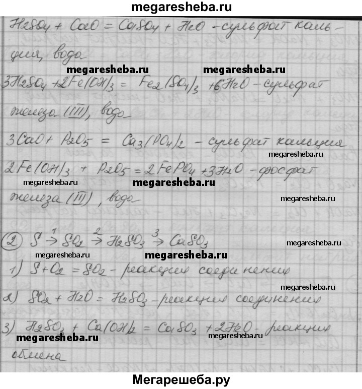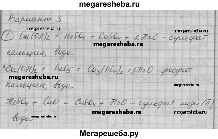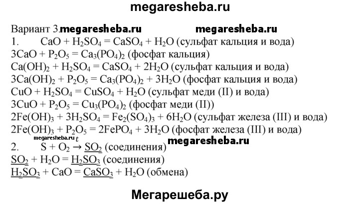 Вариант 3 1. Даны вещества: гидроксид кальция, раствор серной кислоты, оксид меди(ll), оксид кальция, оксид фосфора(V), гидроксид железа(lll). Какие из этих веществ будут взаимодействовать между собой? Напишите уравнения реакций и назовите образующиеся вещества. 2. Как осуществить следующие превращения: сера —> оксид cepы(IV) —> сернистая кислота —> сульфит кальция? Напишите уравнения реакций и укажите тип каждой реакции.