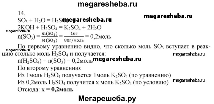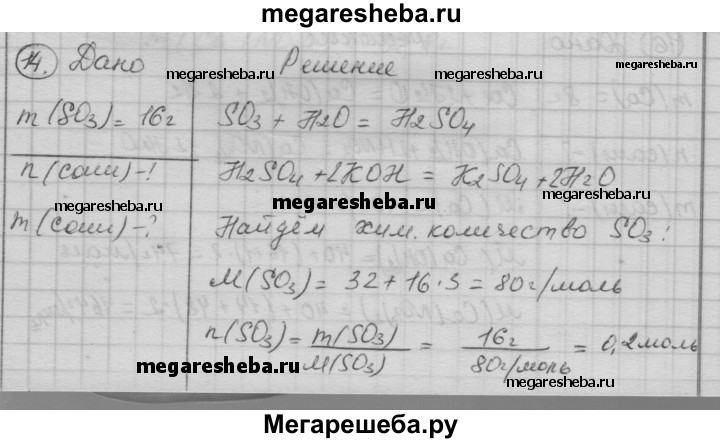 14. Оксид серы(Vl) массой 16 г полностью прореагировал с водой. Полученный раствор кислоты нейтрализовали раствором гидроксида калия. Рассчитайте количество вещества и массу образовавшейся соли.