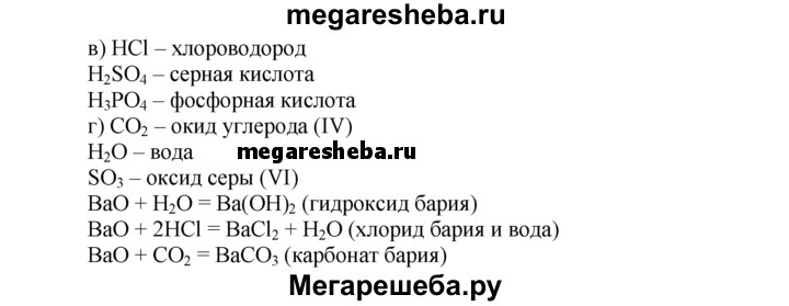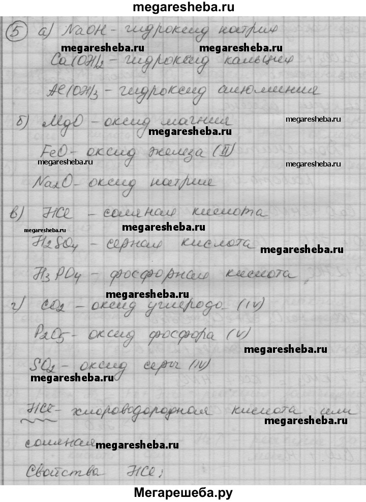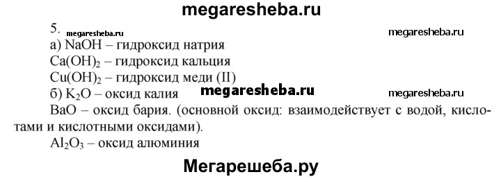 5. Напишите формулы и укажите названия: а) трех оснований; б) трех оксидов металлов; в) трех кислот; г) трех оксидов неметаллов. Составьте уравнения реакций, характеризующих химические свойства одного из названных веществ.
