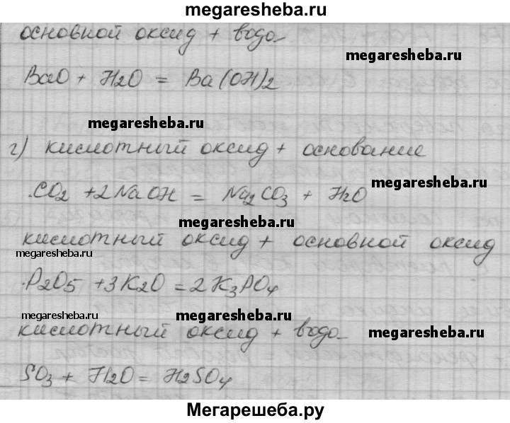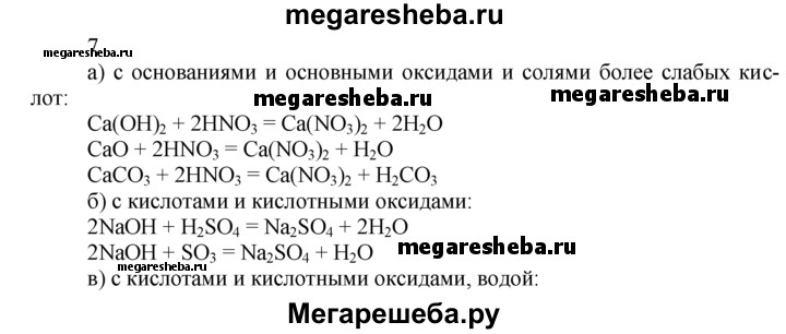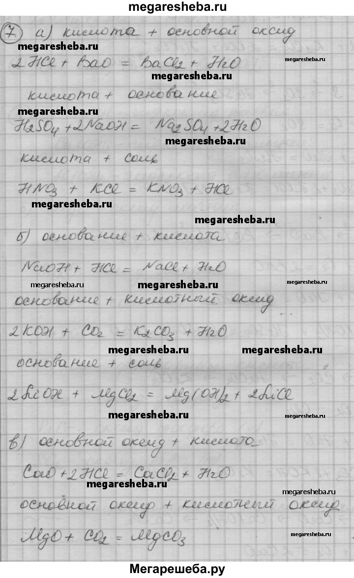 7. С веществами каких классов взаимодействуют: а) кислоты; б) основания; в) основные оксиды; г) кислотные оксиды? Напишите уравнения соответствующих реакций.