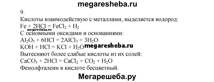 9. Ученику выданы склянки с веществами СаСO3, АI2O3, Fe и растворы КОН, НСI и фенолфталеина. Какие реакции, характерные для кислот, можно провести, пользуясь этими веществами? Напишите уравнения соответствующих реакций.