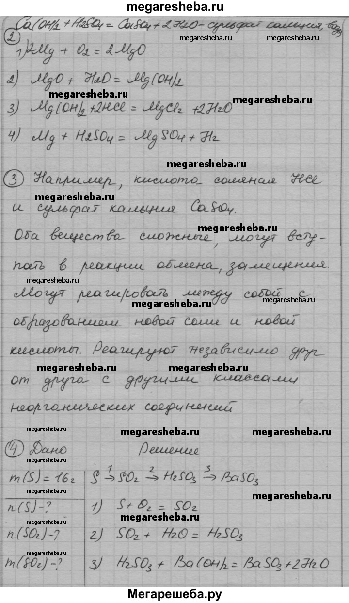 Вариант 3 1. Даны вещества: цинк, раствор серной кислоты, оксид меди(ll), вода, гидроксид кальция, оксид углерода(lV). Какие из них будут взаимодействовать между собой? Напишите уравнения реакций и назовите образующиеся вещества. 2. Напишите уравнения реакций, позволяющих осуществить следующие превращения: 3. Чем сходны и чем различаются по составу кислота и соль? Ответ поясните примерами. 4. Рассчитайте количество вещества (моль) и массу каждого продукта, образующегося при проведении следующих превращений: сера —> оксид серы(lV) —> сернистая кислота —> сульфит бария, если было взято 16 г серы.