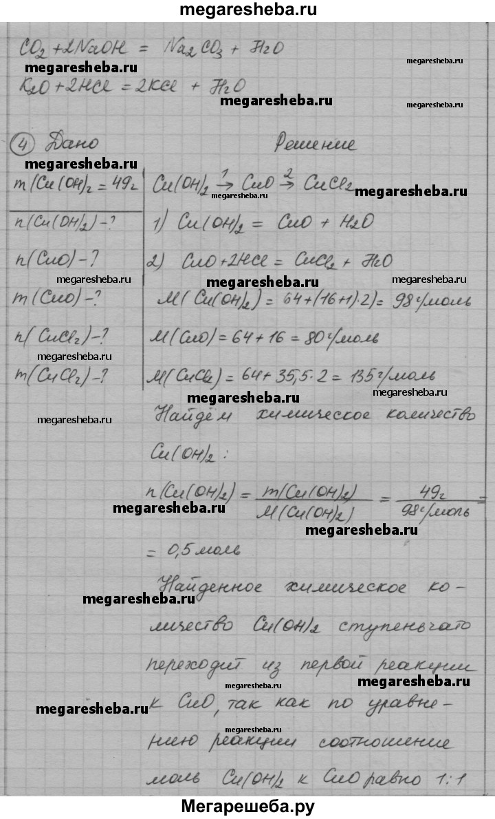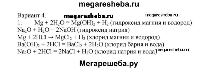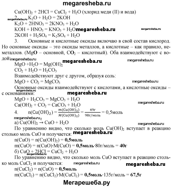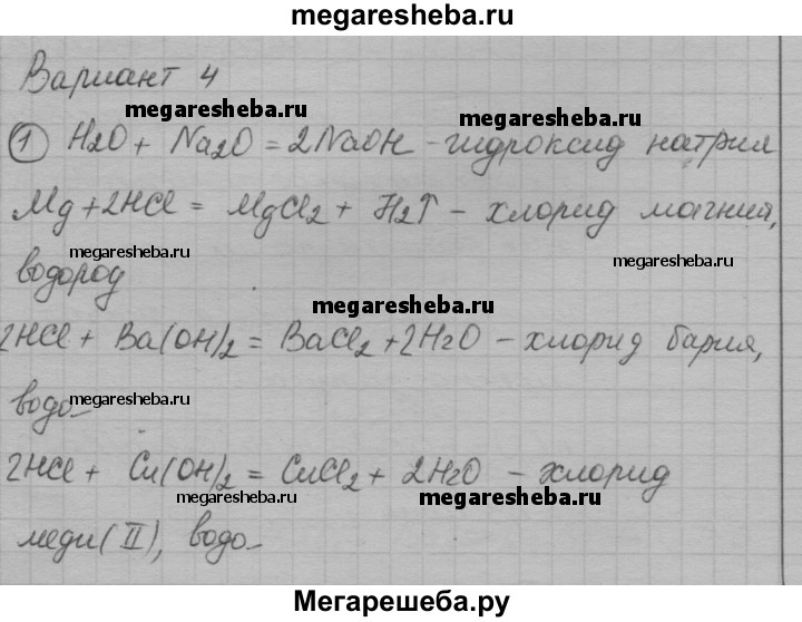 Вариант 4 1. Даны вещества: вода, соляная кислота, магний, гидроксид бария, оксид натрия, гидроксид меди(ll). Какие из них будут взаимодействовать между собой? Напишите уравнения реакций и назовите образующиеся вещества. 2. Напишите уравнения реакций, позволяющих осуществить следующие превращения: 3. Чем сходны и чем различаются по составу и свойствам основные и кислотные оксиды? Ответ поясните примерами. 4. Рассчитайте количество вещества (моль) и массу каждого продукта, образующегося при проведении следующих превращений: гидроксид меди(ll) —> оксид меди(II) —> хлорид меди(II), если было взято 49 г гидроксида меди(II).