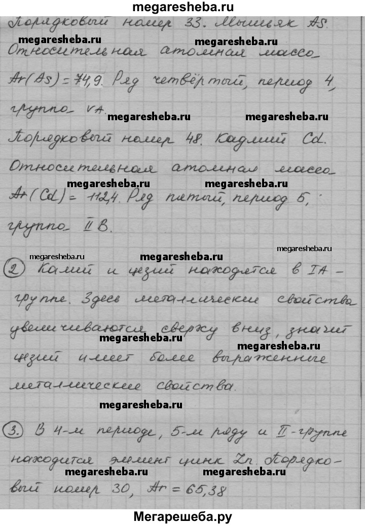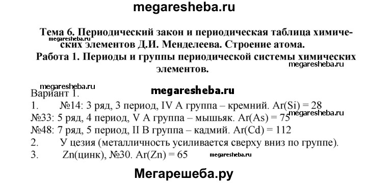 Вариант 1 1. Определите ряд, период и группу, в которых находятся элементы с порядковыми номерами 14, 33, 48. Как называются эти элементы? Каковы их относительные атомные массы? 2. У какого из элементов IA-группы: калия или цезия — сильнее выражены металлические свойства? 3. Определите порядковый номер, название и относительную атомную массу элемента, находящегося в 4-м периоде, 5-м ряду, II группе.