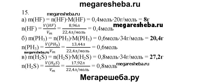15. Рассчитайте массу (н. у.): а) 8,96 л газообразного соединения фтора с водородом; б) 13,44 л газообразного соединения фосфора с водородом; в) 17,92 л газообразного соединения серы с водородом.