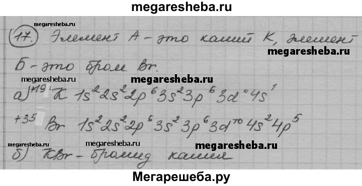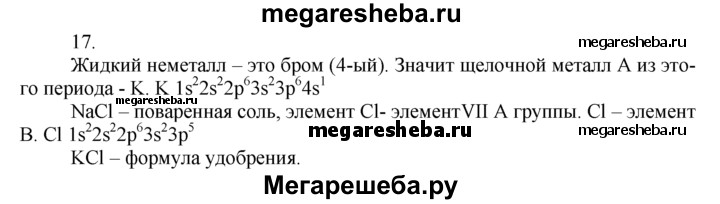 17. Вещество, используемое в качестве минерального удобрения, состоит из двух элементов — А и Б. Соответствующее элементу А простое вещество — щелочной металл. Элемент А принадлежит к тому же периоду, что и элемент, образующий единственный неметалл, жидкий при обычных условиях. Элемент Б находится в VIIA-группе, его атомы входят в состав поваренной соли. Определите элементы А и Б и напишите: а) электронные формулы их атомов; б) формулу вещества, образующегося при их взаимодействии.