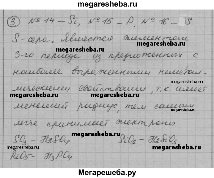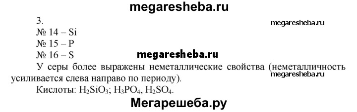3. Какое простое вещество — образованное элементом № 14, № 15 или № 16 — имеет наиболее ярко выраженные неметаллические свойства? Почему? Напишите формулы кислот, соответствующих высшим оксидам этих элементов.