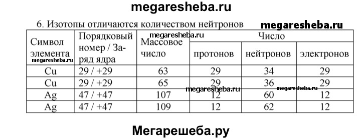 6. Чем различается состав ядер изотопов: а) 63^Сu и 65^Сu; б) 107^Ag и 109^Ag? Дайте обоснованный ответ на основании расчетов.