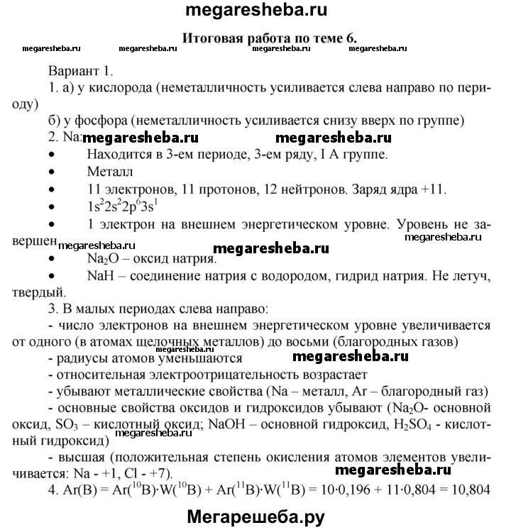 Вариант 1 1. У какого элемента сильнее выражены неметаллические свойства: а) у кислорода или углерода; б) у фосфора или мышьяка? Дайте обоснованный ответ на основании положения элементов в периодической таблице. 2. Дайте характеристику элемента № 11 по плану: • положение в периодической таблице • металл или неметалл • строение атома • электронная формула • число электронов на наружном энергетическом уровне, является ли он завершенным • формула высшего оксида • образует ли элемент летучее соединение с водородом, если образует, какова его химическая формула 3. Как и почему изменяются свойства химических элементов в периодах? Покажите это на примере элементов 3-го периода. 4. Рассчитайте относительную атомную массу бора, если известно, что доля изотопа 10^В составляет 19,6%, а изотопа ll^В - 80,4%. (Ответ: 10,8.)
