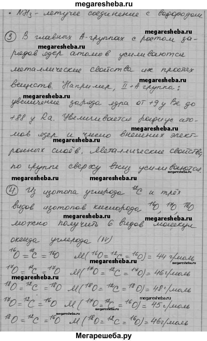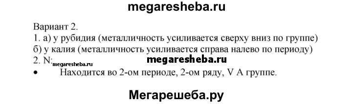Вариант 2 1. У какого элемента сильнее выражены металлические свойства: а) у лития или рубидия; б) у калия или скандия? Дайте обоснованный ответ на основании положения элементов в периодической таблице. 2. Дайте характеристику элемента № 7 по плану: • положение в периодической таблице • металл или неметалл • строение атома • электронная формула • число электронов на наружном энергетическом уровне, является ли он завершенным • формула высшего оксида • образует ли элемент летучее соединение с водородом, если образует, какова его химическая формула 3. Как изменяются свойства химических элементов в А-группах? Покажите это на примере элементов llА-группы. 4. Сколько различных видов молекул оксида углерода(lV) можно получить из изотопа углерода 12^С и трех изотопов кислорода: 16^O, 17^O, 18^O? Напишите формулы всех оксидов и рассчитайте их молярные массы.