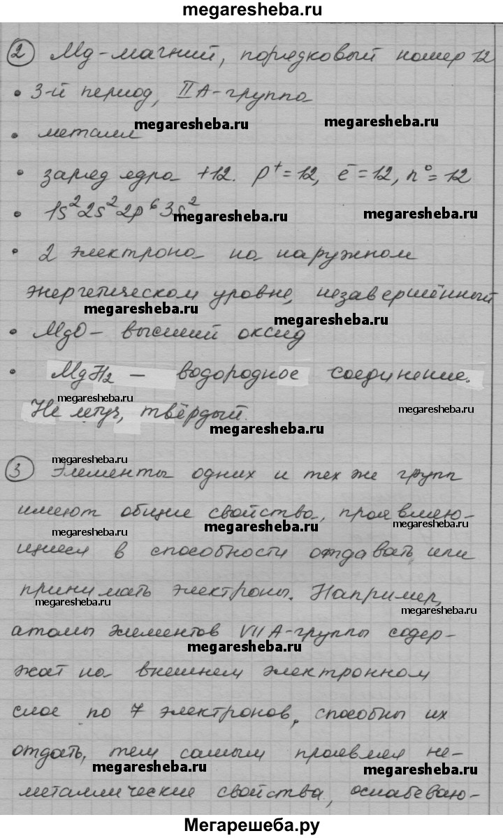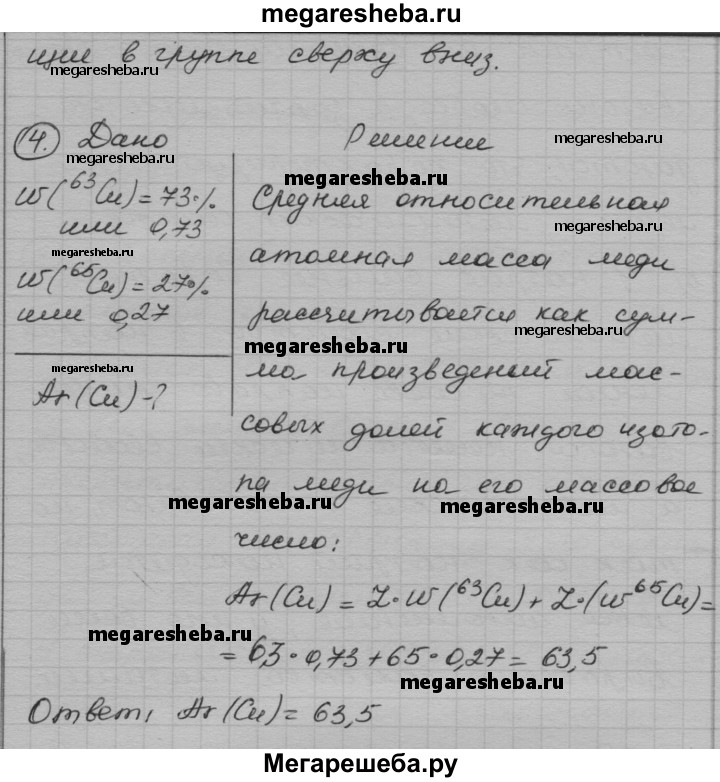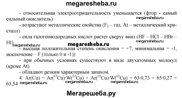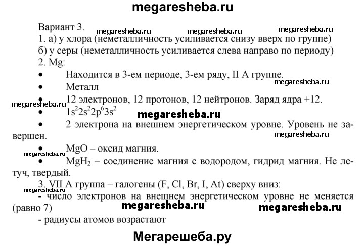 Вариант 3 1. У какого элемента сильнее выражены неметаллические свойства: а) у хлора или иода; б) у серы или кремния? Дайте обоснованный ответ на основании положения элементов в периодической таблице. 2. Дайте характеристику элемента № 12 по плану: • положение в периодической таблице • металл или неметалл • строение атома • электронная формула • число электронов на наружном энергетическом уровне, является ли он завершенным • формула высшего оксида • образует ли элемент летучее соединение с водородом, если образует, какова его химическая формула 3. Какие общие свойства проявляют элементы одних и тех же групп? Покажите это на примере элементов VIIA-группы. 4. Медь имеет два изотопа: 63^Сu и 65^Сu. Их доли в природной меди составляют 73 и 27% соответственно. Рассчитайте среднюю относительную атомную массу меди.