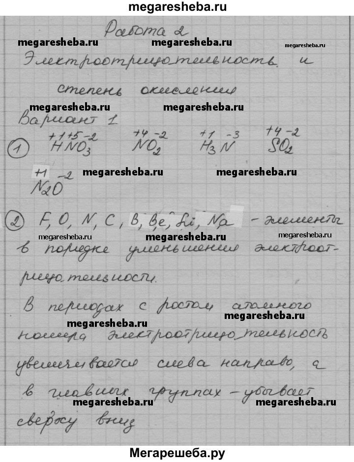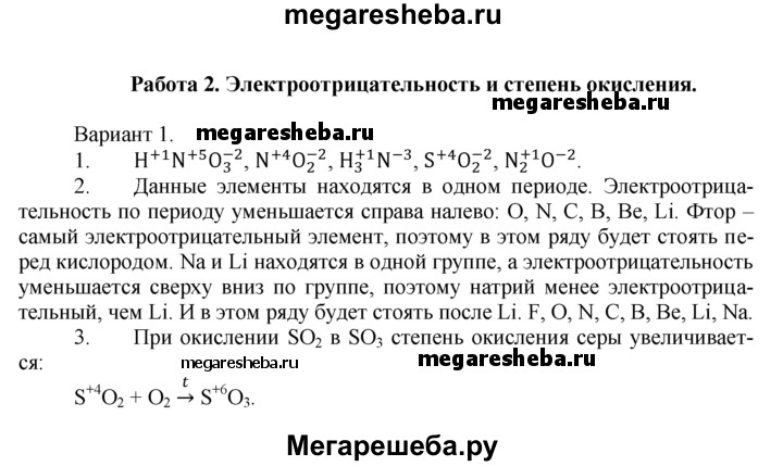 Вариант 1 1. Определите степень окисления атомов химических элементов в следующих соединениях: HNO3, NO2, H3N, SO2, N2O. 2. Пользуясь периодической таблицей, расположите в порядке уменьшения электроотрицательности следующие элементы: О, N, Be, В, Li, С. Определите, где в этом ряду должны располагаться фтор и натрий. Поясните ответ. 3. Как изменяется степень окисления атома серы при окислении SO2 до SO3? Ответ поясните.