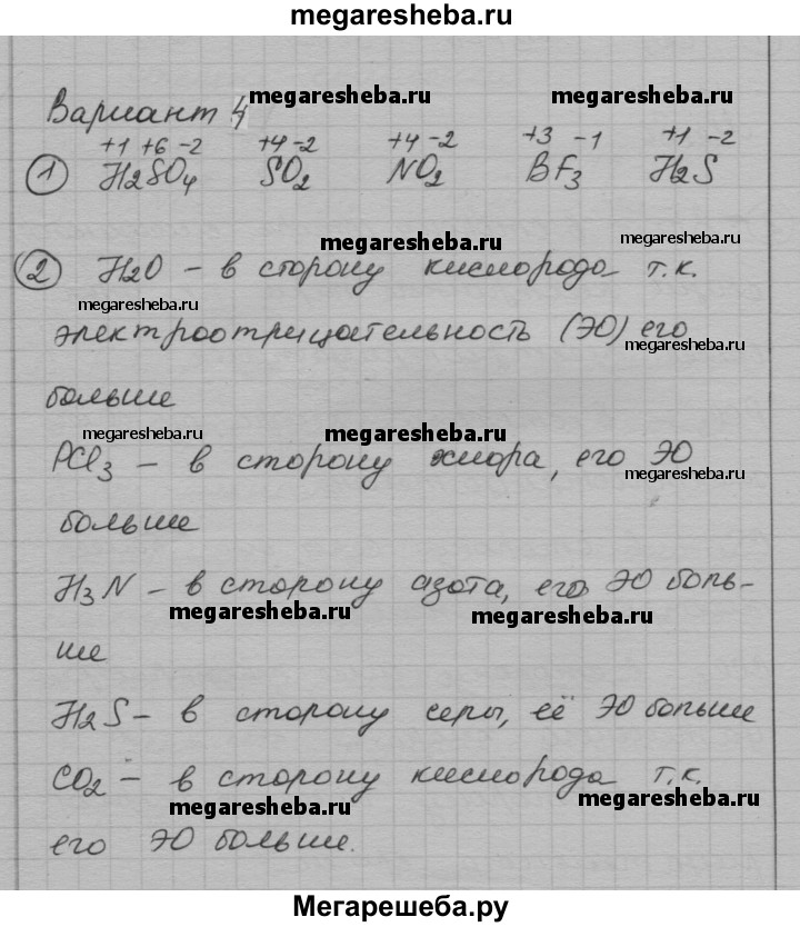Вариант 4 1. Определите степень окисления атомов химических элементов в следующих соединениях: H2SO4, SO2, NO2, BF3, H2S. 2. В сторону атомов какого химического элемента смещаются общие электронные пары в молекулах следующих соединений: Н2O, РСI3, H3N, H2S, СO2? Дайте обоснованный ответ. 3. Изменяются ли степени окисления атомов при образовании воды из простых веществ — водорода и кислорода? Ответ поясните.