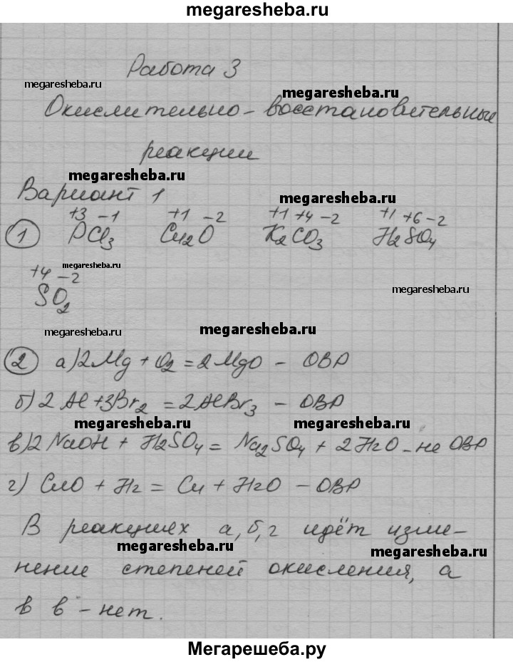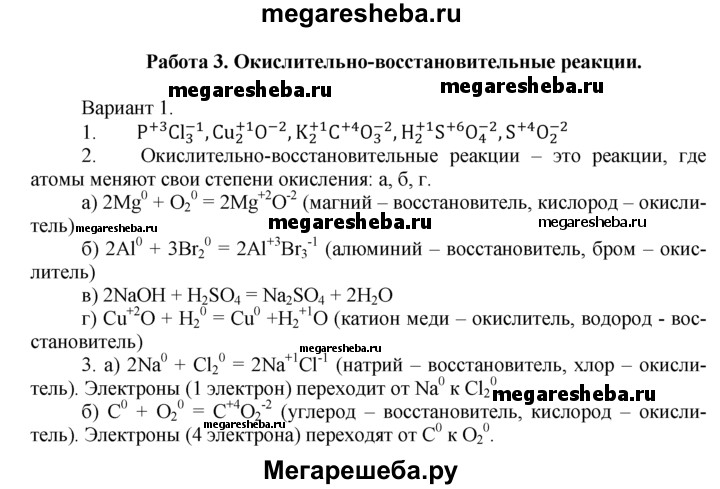 Вариант 1 1. Определите степени окисления атомов в соединениях РСI3, Cu2O, К2СО3, H2SO4 и SO2. 2. Допишите уравнения реакций, расставьте коэффициенты. Укажите, какие реакции являются окислительно-восстановительными, и поясните свой выбор. а) Mg + O2 = б) АI + Вr2 = в) NaOH + H2SO4 = г) СuО + Н2 = 3. Допишите уравнения реакций, расставьте коэффициенты. Укажите степени окисления атомов, окислитель, восстановитель и стрелкой покажите переход электронов. a) Na + СI2 = б) С + O2 =