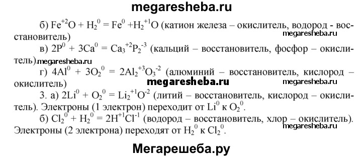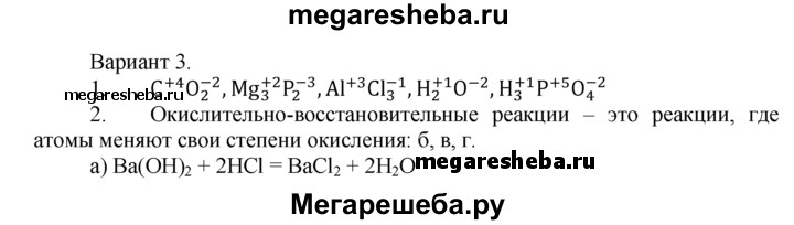 Вариант 3 1. Определите степени окисления атомов в соединениях СO2, Mg3P2, АIСI3, Н2O и Н3РO4. 2. Допишите уравнения реакций, расставьте коэффициенты. Укажите, какие реакции являются окислительно-восстановительными, и поясните свой выбор. а) Ва(ОН)2 + НСI = б) FeO + Н2 = в) Р + Са = г) АI + O2 = 3. Допишите уравнения реакций, расставьте коэффициенты. Укажите степени окисления атомов, окислитель, восстановитель и стрелкой покажите переход электронов. a) Li + O2 = б) СI2 + Н2 =