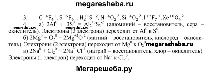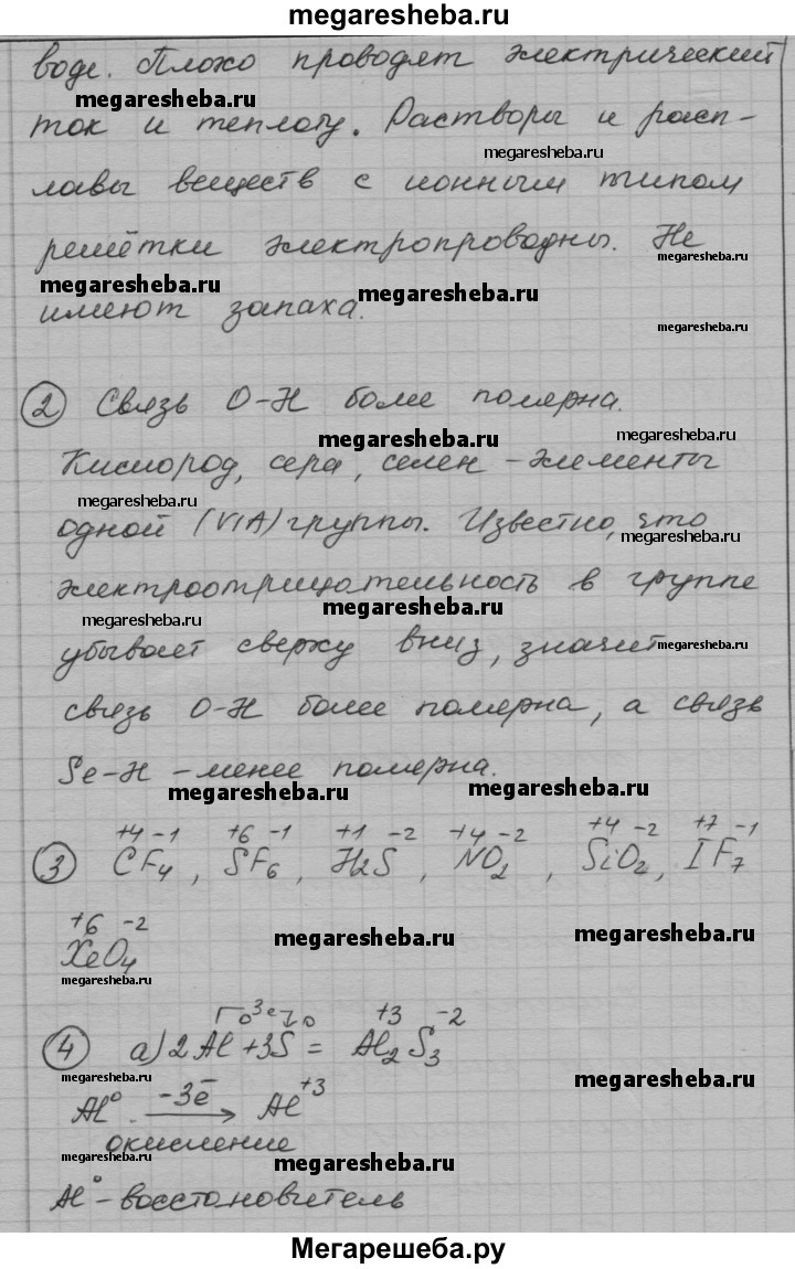 Вариант 1 1. Определите вид химической связи и тип кристаллической решетки в следующих веществах: фторид калия, вода (лед), алмаз, бромид натрия. Какие физические свойства характерны для веществ с ионными кристаллическими решетками? 2. Учитывая положение кислорода, серы и селена в периодической таблице и их электроотрицательность, укажите, какая связь более полярна: О—Н, S—Н или Se—Н. Дайте обоснованный ответ. 3. Определите степени окисления атомов в следующих соединениях: CF4, SF6, H2S, NO2, SiO2, IF7, XeO4. 4. Допишите уравнения реакций, расставьте коэффициенты. Укажите степень окисления атомов, окислитель, восстановитель и стрелкой покажите переход электронов. а) АI + S = б) Mg + O2 = в) Na + СI2 =