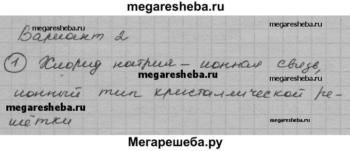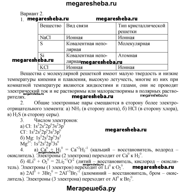 Вариант 2 1. Определите вид химической связи и тип кристаллической решетки в следующих веществах: хлорид натрия, сера, кремний, хлорид калия. Какие физические свойства характерны для веществ с молекулярными кристаллическими решетками? 2. Учитывая значения электроотрицательности атомов, составьте химические формулы и укажите сдвиг общих электронных пар в следующих соединениях: а) водорода с азотом; б) водорода с хлором; в) водорода с серой. 3. Чем различаются по строению нейтральные атомы и ионы: а) СI и СI-; б) Mg и Mg2+? Ответ поясните. 4. Допишите уравнения реакций, расставьте коэффициенты. Укажите степень окисления атомов, окислитель, восстановитель и стрелкой покажите переход электронов. а) Са + Н2 = б) Li + O2 = в) АI + Вr2 =
