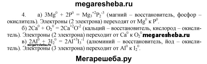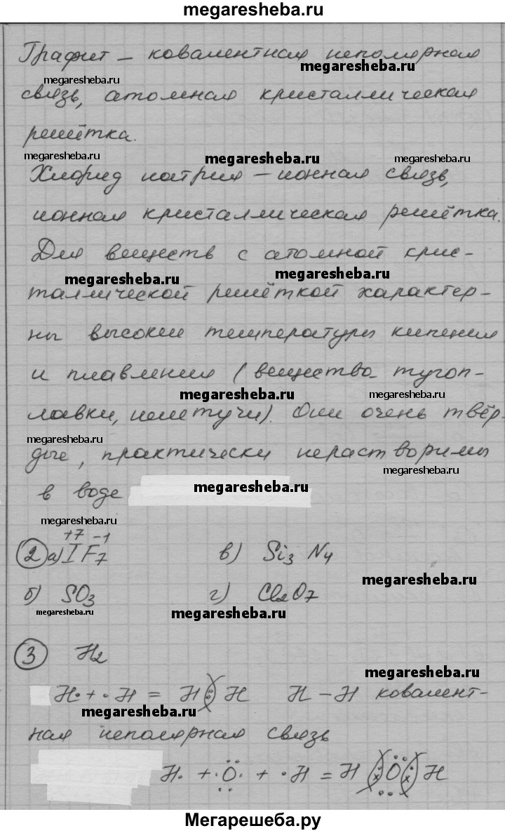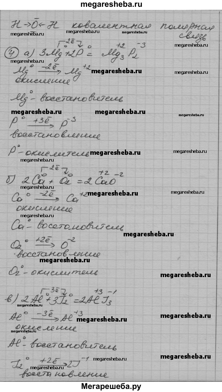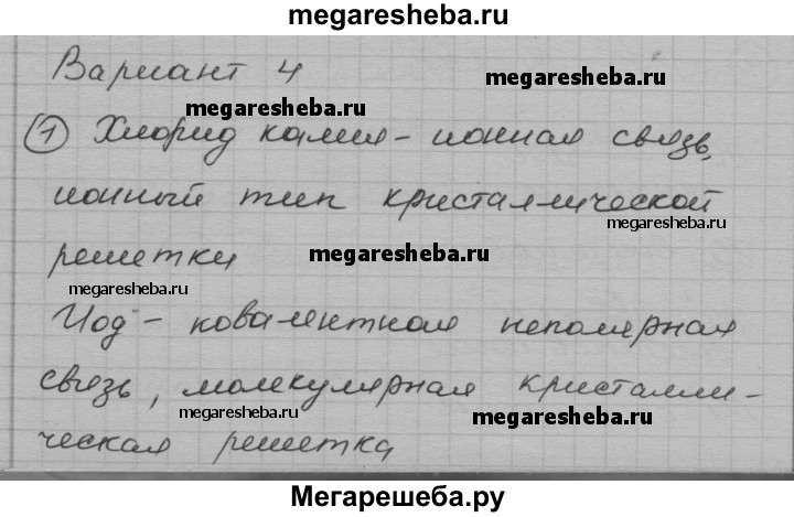 Вариант 4 1. Определите вид химической связи и тип кристаллической решетки в следующих веществах: хлорид калия, иод, графит, хлорид натрия. Какие физические свойства характерны для веществ с атомными кристаллическими решетками? 2. Составьте формулы следующих соединений: а) фторида иода; б) высшего оксида серы; в) нитрида кремния (соединение кремния с азотом); г) высшего оксида хлора. (В названных соединениях элемент, отдающий электроны, проявляет высшее значение степени окисления.)? 3. Изобразите схемы образования молекул водорода и воды. Определите вид химической связи в этих молекулах. 4. Допишите уравнения реакций, расставьте коэффициенты. Укажите степень окисления атомов, окислитель, восстановитель и стрелкой покажите переход электронов. a) Mg + Р = б) Са + O2 = в) АI + I2 =