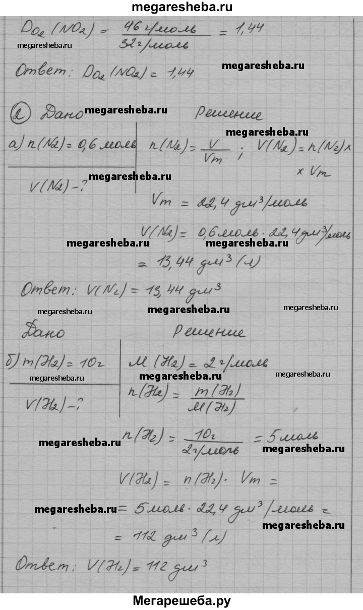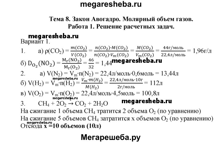 Вариант 1 1. Рассчитайте: а) плотность (н. у.) оксида углерода(lV), г/л; б) относительную плотность оксида азота(lV) по кислороду. 2. Рассчитайте, какой объем (н. у.) займут: а) 0,6 моль азота N2; б) 10 г водорода Н2; в) 4,5 моль кислорода.? 3. Вычислите, какой объем кислорода потребуется для сжигания 5 л метана СН4 (н. у.).