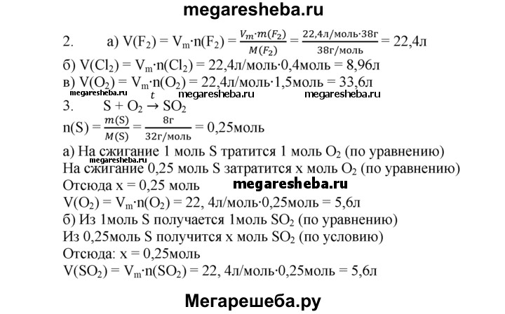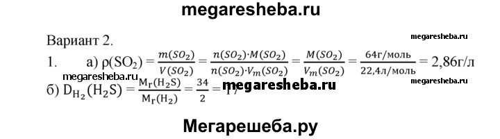 Вариант 2 1. Рассчитайте: а) плотность (н. у.) оксида cepы(IV), г/л; б) относительную плотность сероводорода H2S по водороду. 2. Рассчитайте, какой объем (н. у.) займут: а) 38 г фтора F2; б) 0,4 моль хлора СI2; в) 1,5 моль кислорода. 3. Сгорело 8 г серы. Вычислите: а) объем вступившего в реакцию кислорода; б) объем образовавшегося оксида серы(IV) (н. у.).