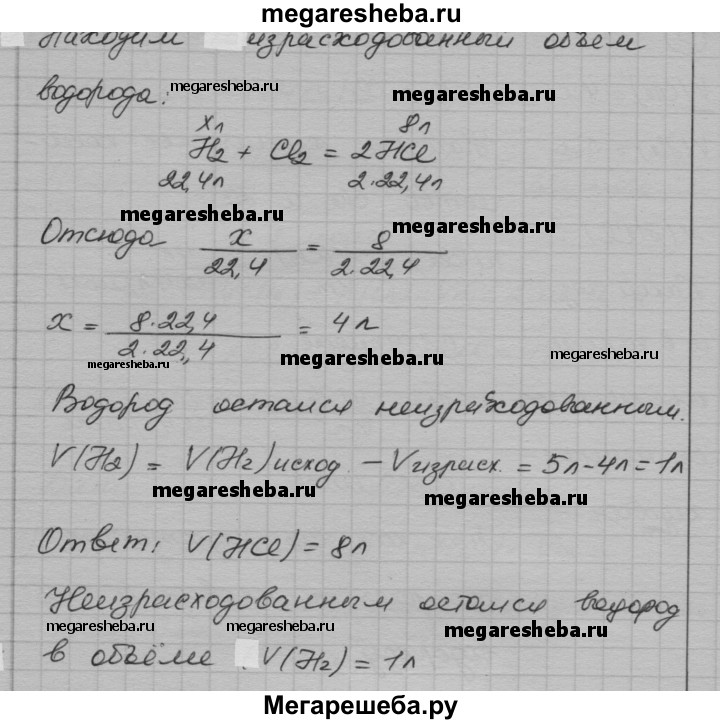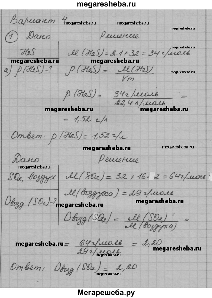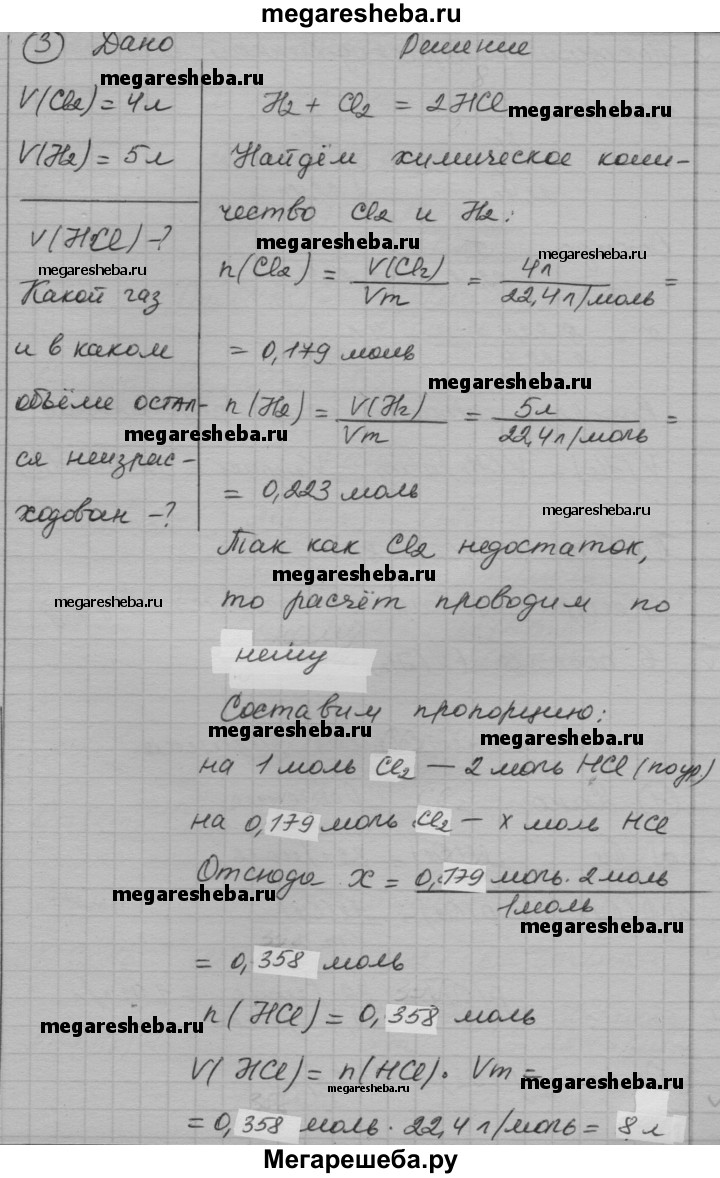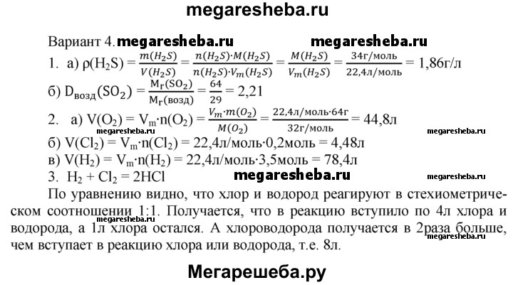 Вариант 4 1. Рассчитайте: а) плотность (н. у.) сероводорода H2S, г/л; б) относительную плотность оксида cepы (IV) по воздуху. 2. Рассчитайте, какой объем (н. у.) займут: а) 64 г кислорода O2; б) 0,2 моль хлора; в) 3,5 моль водорода. 3. Смешали 4 л хлора и 5 л водорода. Смесь взорвали. Вычислите объем образовавшегося хлороводорода НСI (н. у.). Какой газ и в каком объеме остался неизрасходованным?