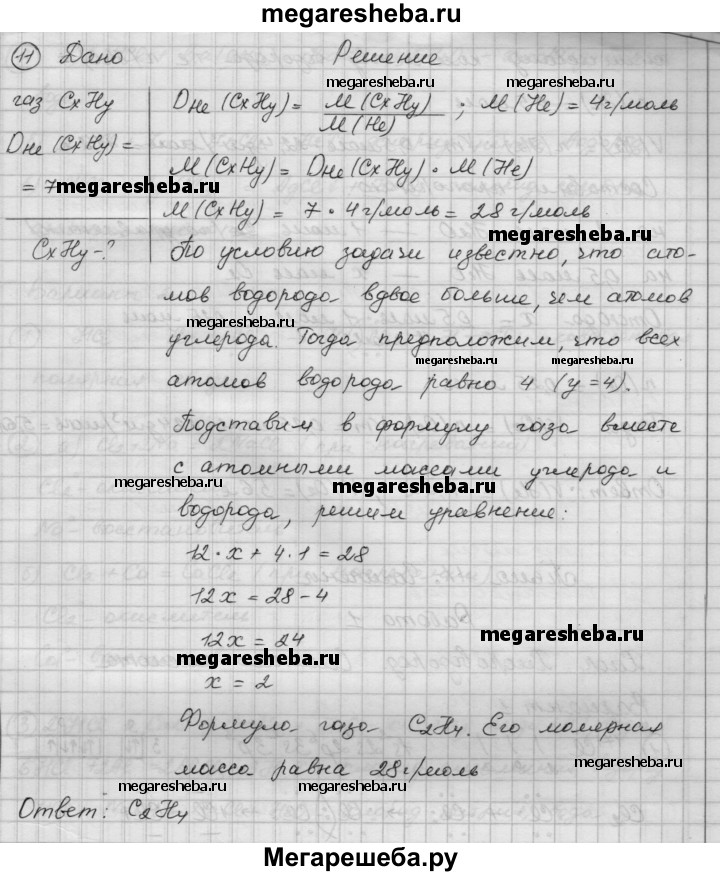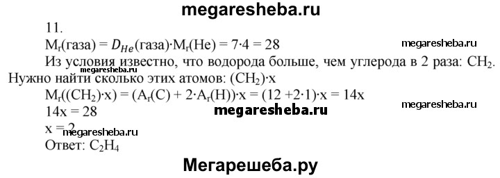 11. Неизвестный газ содержит атомов водорода вдвое больше, чем атомов углерода. Относительная плотность газа по гелию равна 7. Выведите формулу этого газа.