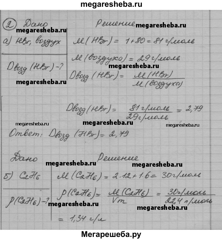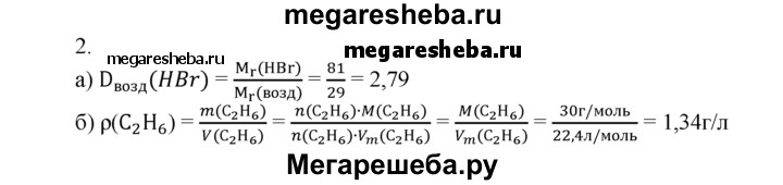 2. Рассчитайте: а) относительную плотность газа бромоводорода НВr по воздуху; б) плотность (н. у.) этана С2Н6, г/л.